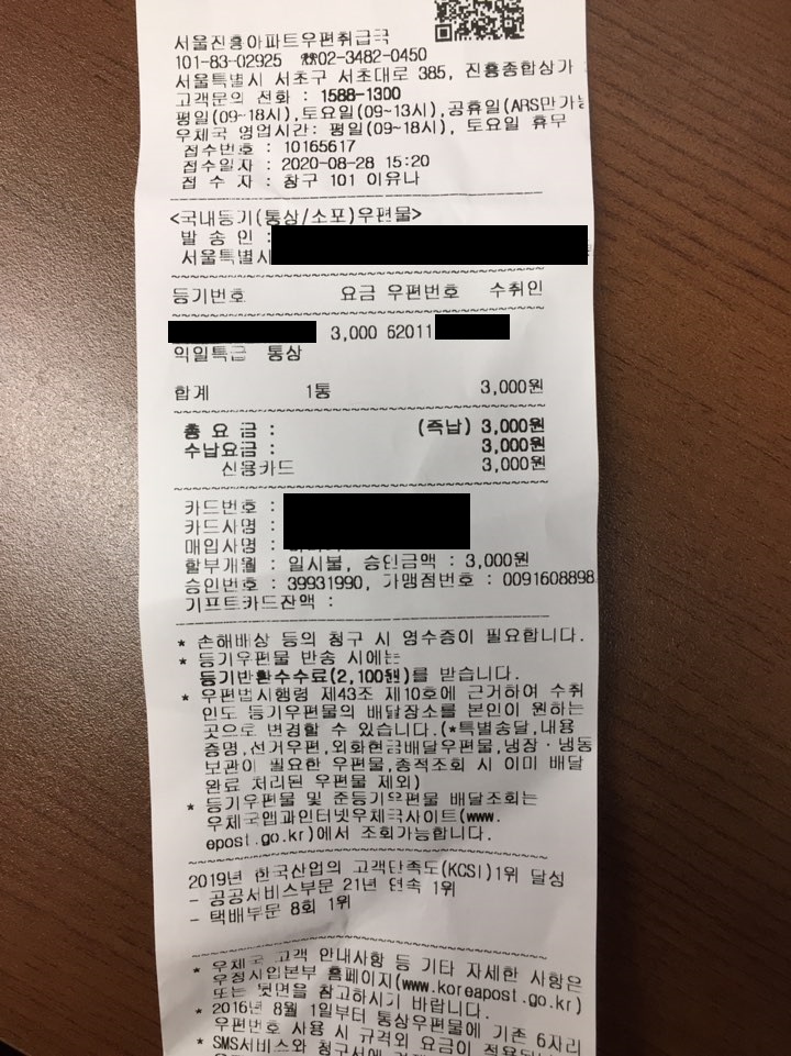 저는 3000원이 나왔습니다. 등기번호 밑에 보시면 아시겠지만 빠른등기인 익일특급으로 보냈고 편지봉투지만 내용물이 무게가 쪼끔 나온건지 기준보다는 몇백원 비싸게 나왔네요.