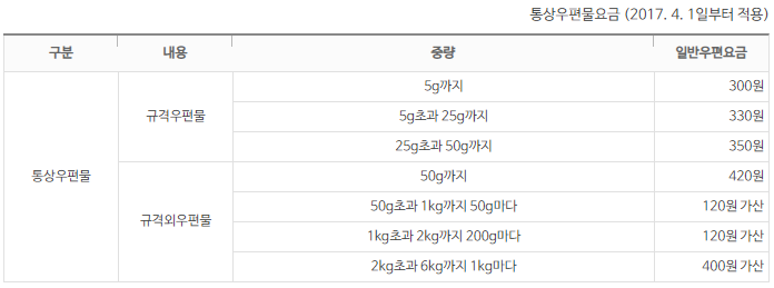 먼저 규격우편물! 과거에 흔히 썼던 그 하얀 편지봉투 혹은 엽서로 보내던 그런 우편을 얘기하는 거에요. 아래 표를 보시면 중량에 따라 가격차이가 있고 우표를 붙여서 보낼때 중량이 초과되서 우표값을 넘어버리면 그대로 반송도 되니 주의해주셔야해요. 규격 외 우편물은 서류봉투같은 크기가 큰 우편을 말하고 크기가 큰 만큼 가격도 더 비쌉니다.