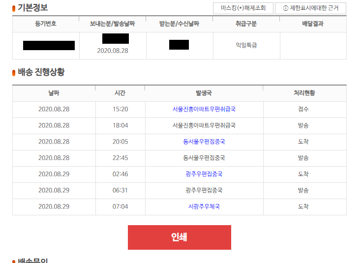 이제 제가 어제 보냈던 등기우편입니다. 등기는 일반등기와 빠른등기가 있는데 당연히 가격 차이가 있겠죠? 일반우편과 다른점은 배송추적이 가능하다는 점과 직접 받는사람에게 전달한다는 점 입니다. 받는사람이 반드시 집에 있어야 하고 집에 없을 경우에 2~3회 정도 재방문을 합니다. 우편함에 넣는다거나 바닥에 둔다거나 하지않아요. 받는사람이 무조건 있어야한다는 점에서 불편할수도 있겠지만 절대 분실될 일이 없습니다.