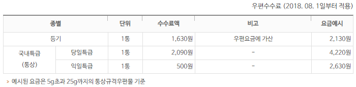 등기우편 비용은 위 표와 같습니다. 기본적으로 1630원이 붙고 무게에 따라서 추가요금, 그리고 빠른등기인 당일특급, 익일특급에 따라 요금이 달라지게 됩니다.