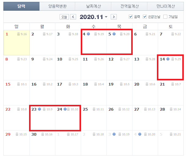 2020년 11월 손없는날은 11월 4,5일, 14일, 23,24일입니다. 음력으로 9월19,20일, 29일, 10월 9,10일이네요.