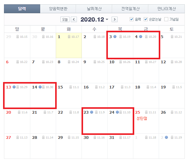 2020년 12월 손없는날은 12월 3,4일, 13,14일, 23,24일이네요!