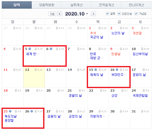 2020년 10월 손없는날은 10월 5,6일 15,16일 25,26일 입니다. 음력날짜를 보시면 음력 8월19,20일, 8월29,30일, 9월9,10일이 해당됩니다.