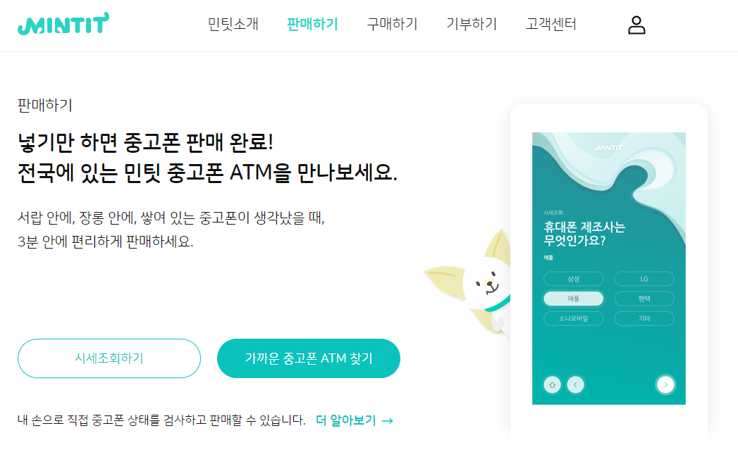 민팃 홈페이지 가서 보통 내 폰이면 얼마에 팔릴까 궁금하신 분은 시세 조회를 해보시고, 조회하시고 팔아야겠다 생각이 드셨다면 가까운 중고폰 ATM찾기를 눌러서 민팃ATM 기계가 있는 곳을 찾아보시면 됩니다.