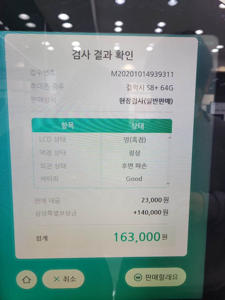 요렇게! 밑에 보시면 삼성특별보상금 +140,000원이 있죠? 상태가 많이 안좋았는지 기본 판매 대금은 적게 나왔네요 ㅠㅠ 뭐 그래도 특별보상금이 있으니~ 판매하면 미니ATM기계가 넣어둔 폰을 꿀떡 합니다 ㅎㅎ