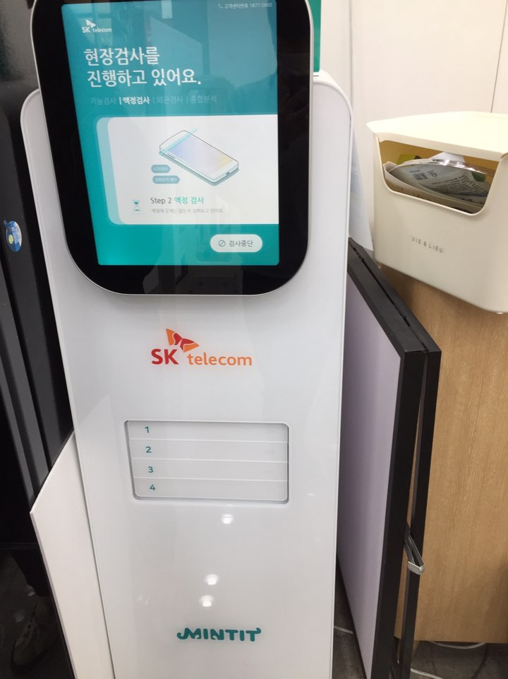 이렇게 생긴 기계가 있어요! 미니ATM이 있는 대리점에 가셔서 직원분께 물어보시면 직원분이 친절하게 알려주는게 아니라 직원분도 잘 모른다고 하시네요... 설치는 했는데 안써봤다구 ㅠㅠ 그래서 직접 눌러가면서 해봤는데 어렵지 않았습니다. 좀 귀찮고 복잡하긴 했지만요. 판매려는 폰으로 미니ATM의 와이파이로 연결하고 민팃 어플 깔고 등등 해야했어요.