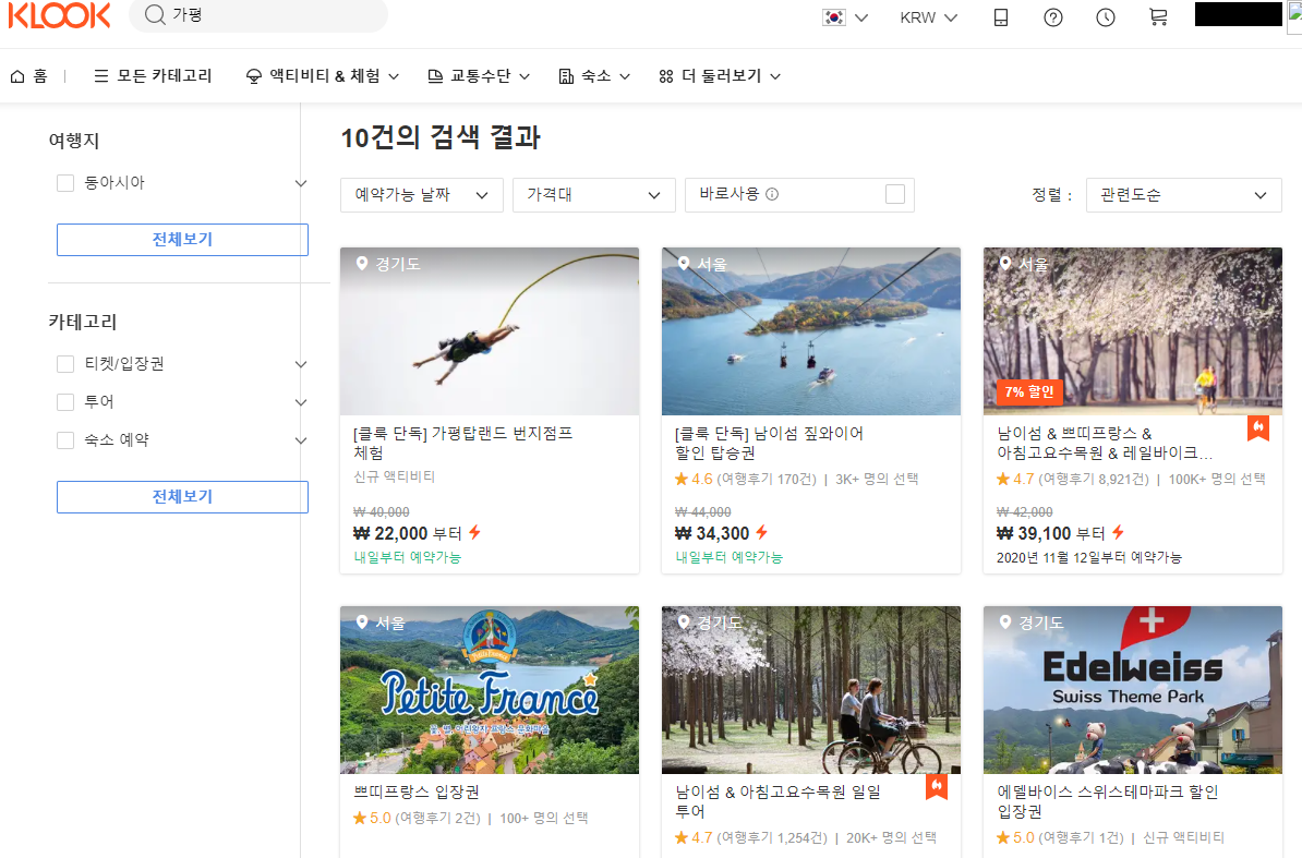 요로코롬 가평을 검색했더니 남이섬 짚와이어 할인 탑승권이랄지, 쁘띠프랑스 입장권이랄지 저런것들이 나오죠?