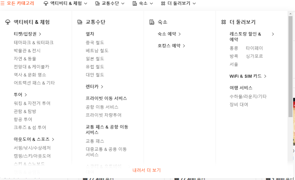 입장권 뿐 아니라 해외 철도라거나 숙소, 교통이라거나 스포츠, 투어 등등 다양한 것들이 많이 있습니다!