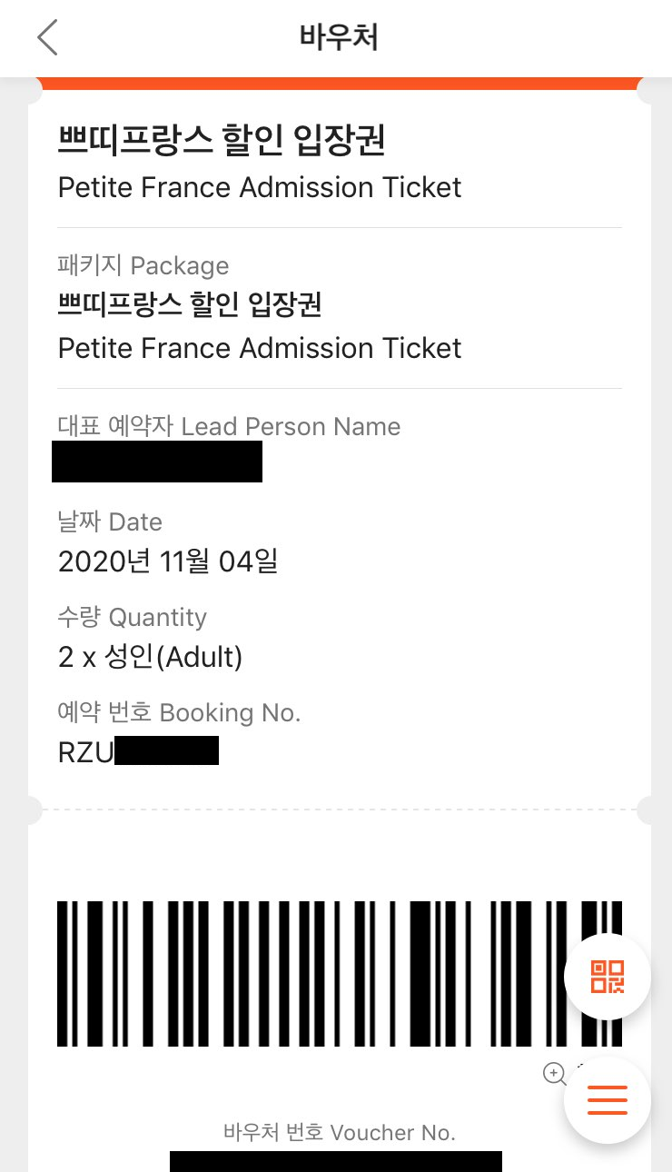 이렇게 바코드와 바우처 번호가 포함된 페이지가 뜹니다. 이거를 입장할때 혹은 매표소 같은데 보여주면 됩니다. 편리하고 좋은데 가격도 더 싸기까지!