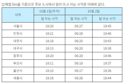 보름달이 뜨는 시각은 서울을 기준으로 오후6시20분이고 가장 높이 뜨는 시간은 10월2일 00시 20분이었다고 하네요.