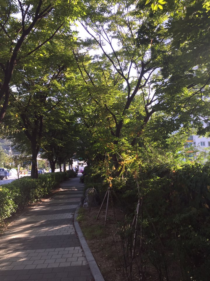 제가 핸드폰이 좀 화질구지폰이라서 제대로 표현이 안된 것 같은데 저 나무들 사이로 햇빛이 쨍 비춰지면서 진짜 그림 나왔었어요 ㅎㅎ 직접 본 맛이 안나서 사진이 쪼꼼 아쉽긴 하지만 그래도 풀색들이 너무 이뻤네요
